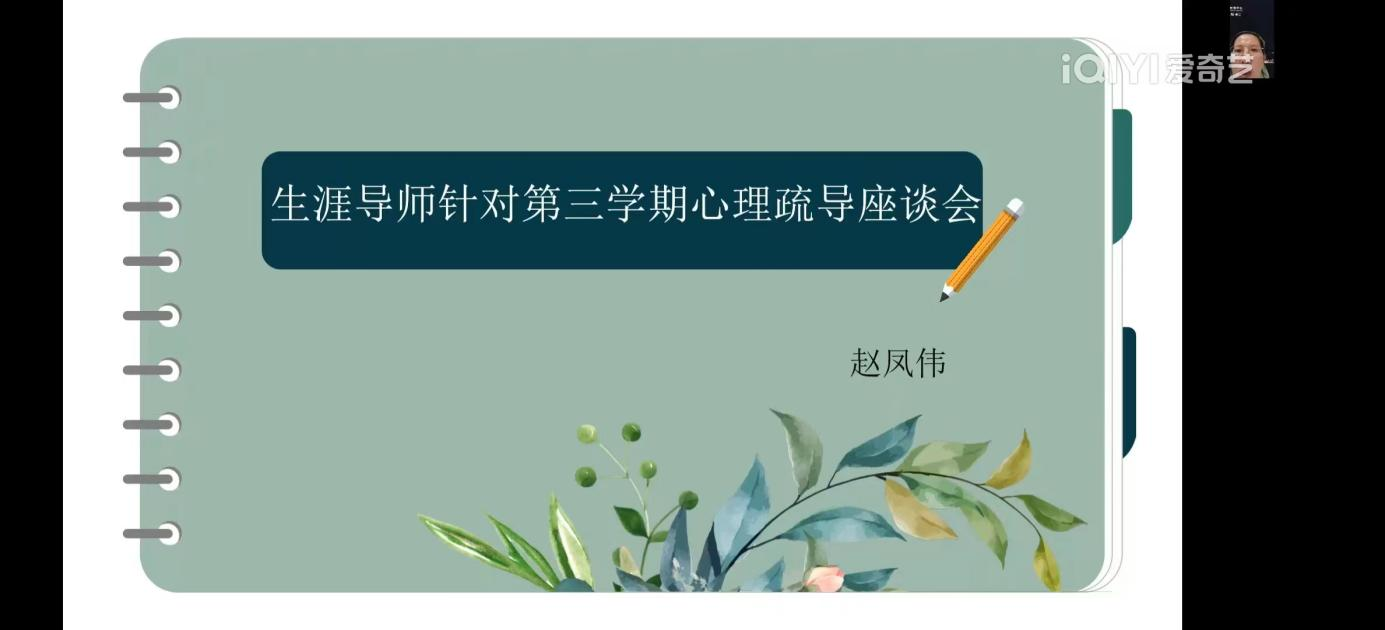 为了避免学生在第三学期实习中出现由于疲倦导致的心理问题,赵凤伟老师于6月27日晚8点通过线上腾讯会议的方式召集自己所带的生涯学生对第三学期开展心理疏导座谈会。
