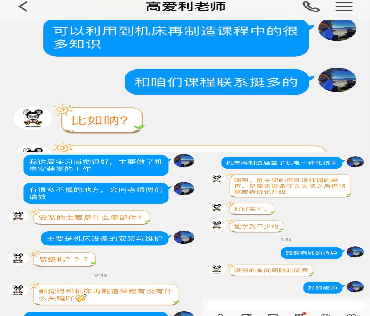 6月21日,指导教师高爱利在QQ上向在哈尔滨瑞镔余热回收设备制造厂实习的学生刘宏博,采用线上聊天的方式对第三学期第一周的实习情况进行了指导。