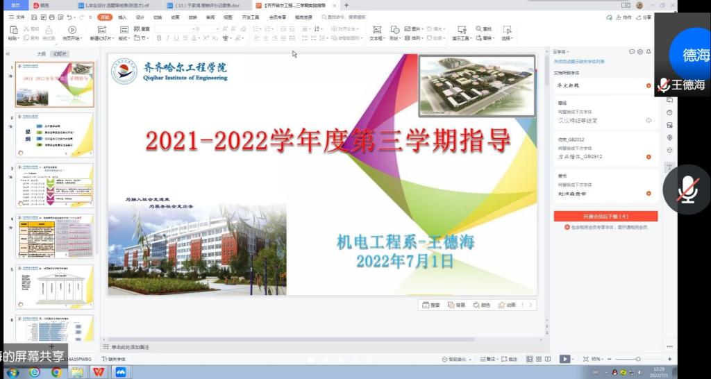 为了解第三学期开展后学生们的实习现状,让同学们更好的在岗位上积极工作,了解各实习单位的情况,王德海老师于2022年7月1日在腾讯会议开展第三学期阶段总结会,本次会议由王德海老师主持,参会老师为刘智老师和姜娜老师,电气191学生全体参加。