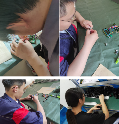 本次实习的内容是在技术员的带领下,参与到工厂内新型数字烟雾检测报警器的研发、测试与组装。目前四人已经进行了进行安全教育、学习企业规章制度、岗位工作职责、防静电标准、产品相关电子技术基本知识培训,能够进行电子元件识别、选用、逐步参与到厂内相关电子产品设计。四名学生提出将杜邦线与直插元件运用到测试型号中的可行性建议,便于不断完善产品,且大大提高容错率,得到了工厂技术员的赞同并投入应用。
