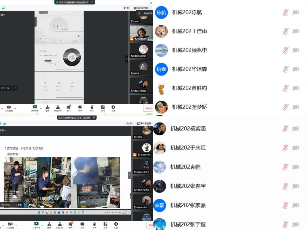 会议中,同学们精心准备了答辩内容,充满自信的开始汇报自己的岗位实习情况并展示了自己的调研报告、工艺卡片。每个同学分享了实习心得与收获。经过六周的实习,同学们都有着深刻的体会,不管在知识积累方面还是实践能力都有着极大的提高,为以后走上工作岗位提供了极大的帮助。