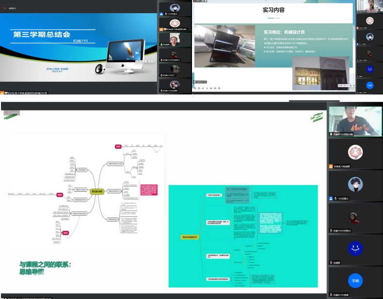 首先,张超群老师讲了一些关于第三学期结束后的安全问题,要时刻注意疫情防控,然后提到了第三学期材料问题,要符合规定、质量要好、按时完成。随后让同学们依次打开自己做的课件和摄像头开始汇报和成果展示,课件包含报道截图、案列分析、调研报告、cad图纸、实习周记、总结和后续两门课程的思维导图。并对存在的问题提出修改意见,将理论与实践相结合。
