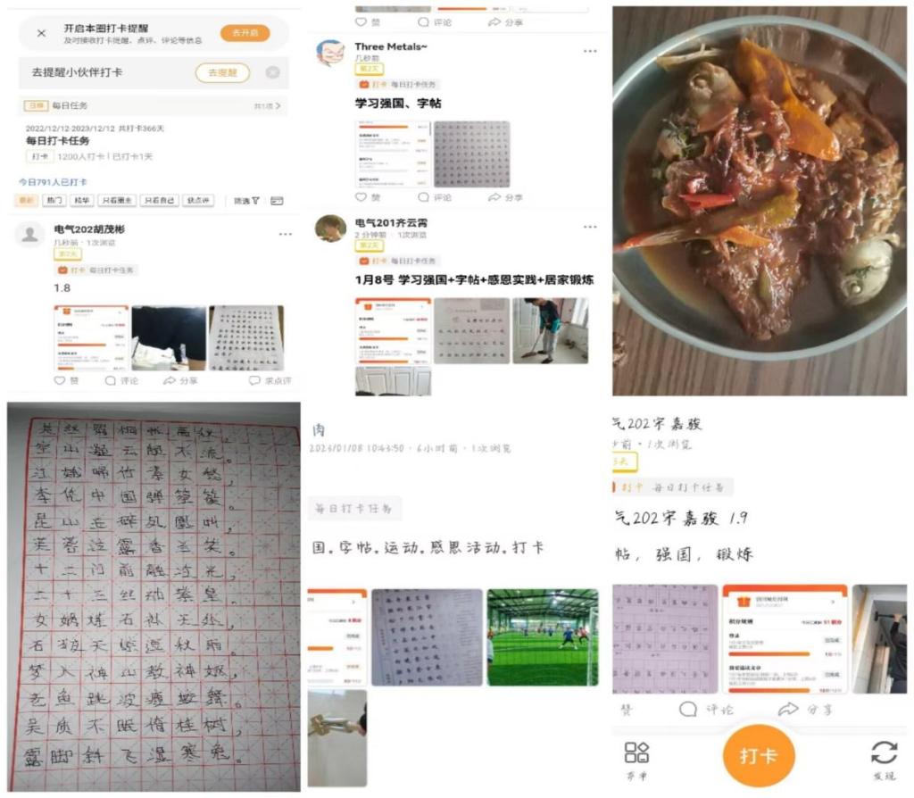 第四学期第一周时间为1月6日至1月8日,在此期间,机电系63组的同学完成了每日的字帖、强国打卡、居家锻炼以及感恩实践任务。