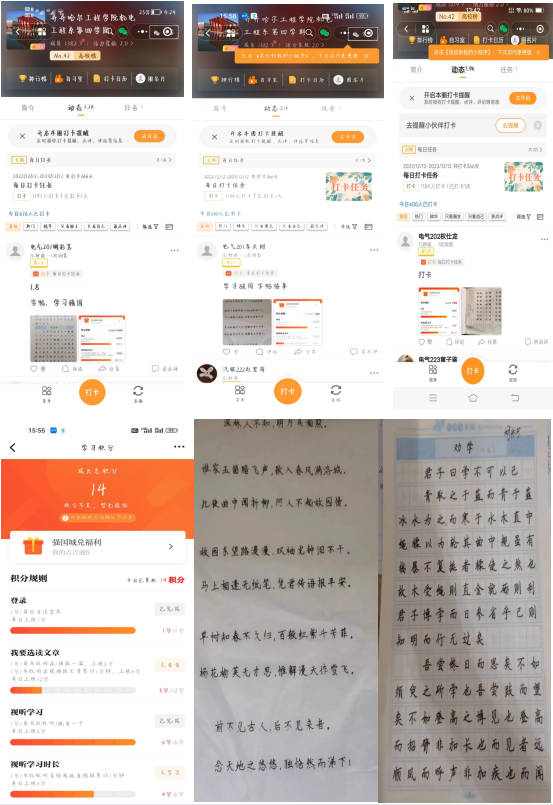 电气201班第四学期第一周从1月6日开始,到1月8日结束,在此期间,机电系35组的同学完成了每日的字帖、学习强国打卡任务。
