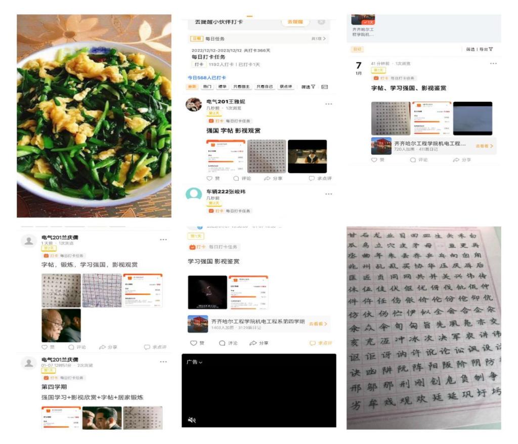 第四学期第一周时间为1月6日至1月8日,在此期间,机电系15组的同学完成了每日的字帖、强国打卡、居家锻炼以及感恩实践任务。