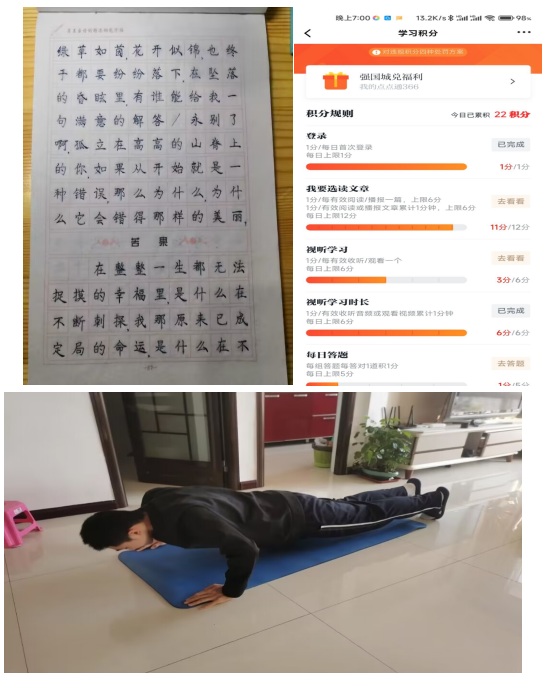 我们在学校的领导下开展了本次第四学期任务。本次实习我们完成了几个项目。在实习前于丽媛老师在腾讯会议上为我们讲解了第四学期注意事项,如第四学期的任务分配、第四学期中的安全问题。本周实习,本周我们进行了字帖书写,学习强国的学习,居家锻炼,感恩实践,对自我的精神得到了极大的提升。现在这个时代,碎片化的信息很多。但学习强国能让我们静下心来了解一些事情,看一些观点,这是很好的。我能及时的跟进形势,国际上的一些热点、新闻,让我们及时了解,丰富了我们形势政策的知识储备。认真开展自学,既能提高党性修养,又可以增加学习内涵。在工作中助力提升工作素养,在生活中助力增加学习氛围。