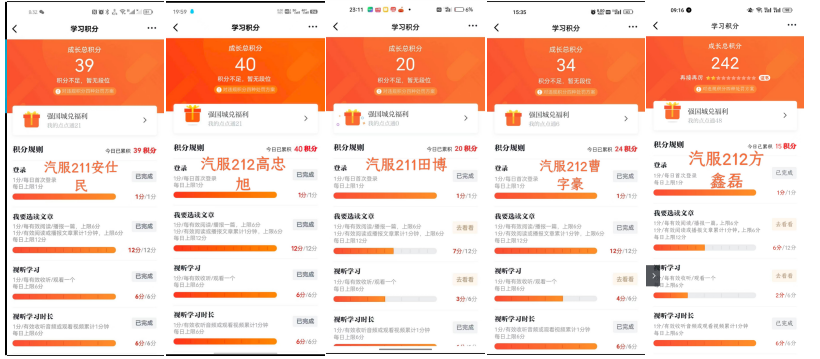 对于时政学习我们有三点要求:1.前期准备2022年1月3日上报学习强国积分情况。2.过程监控所有学生利用学习强国平台进行学习,每周将学习强国积分情况上传到统计表中(例如:第一周七天显示的截图插入周积分表里,)每天的积分相加之和即为合计积分,最后一行统计的六周的合计积分之和为累计积分,评选依据累计积分数排序。3.大二年级个人年度学习积分达到900。
