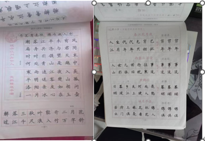 为了积极参与第四学期的活动,我们259组决定利用假期时间提高汉字的美观性,于一月八日开展“临摹字帖”活动,这样既可以提高我们的汉字书写能力,又可以锻炼我们的心性。