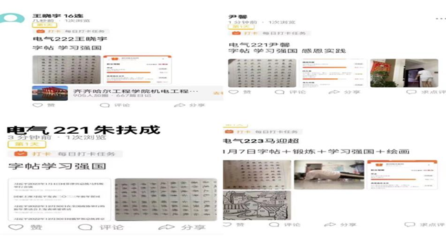 第四学期共有六周,以专业为单位进行3-5人的组队,党员学长协助生涯老师对学生们进行指导。首先学生们对可选项目(三选二)进行了选择,其中三人选择健身锻炼和影视赏析,一人选择健康锻炼和家乡美绘画,五个必选项目分别为:字帖临摹、读书交流、志愿服务、母校回访以及劳动实践。其次学生们利用学习强国这个平台进行学习和答题,通过合理利用学习强国,认真开展自学,既能提高党性修养,又可以增加学习内涵,使学生们全方位了解国家,了解党组织的一种有效方式。最后学生们每日都会用小程序打卡,也是培养学生们自律的一种方式,内容为学生们每日需要完成的任务,,每日完成情况也很清楚。