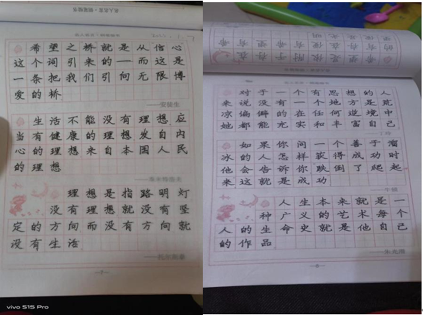 我校以专业为单位,并且在每组中分配了3-4名学生。首先,在第四学期中,学生们每周都会进行字帖临摹,学生们通过临摹书写,慢慢就会适应字的写法,从而书写出具有风格的字来,坚持书写总会有效果的。其次,小组成员对本周的字帖临摹进行拍照分享并做出总结。最后,小组所有成员一起规划下周的学习任务。
