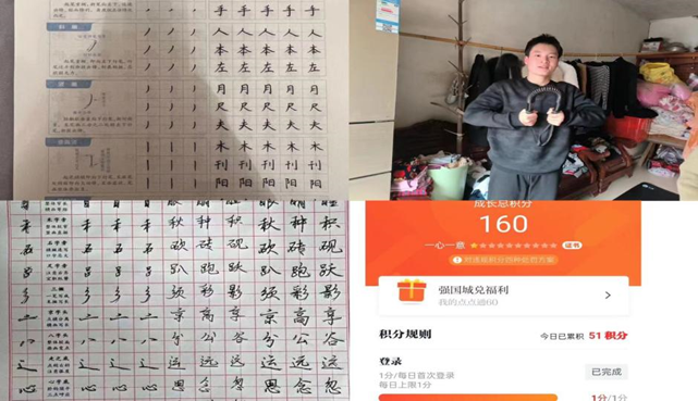 通过对第四学期的了解,我们小组积极展开了各项内容的安排,每日坚持打卡字帖,学习强国,健身锻炼,并且从学习强国平台中丰富了学习内容,集合了大量的时政新闻,文章,图片,视频,科技,人文,历史,了解国内外最新局势,通过阅读文章,了解党中央的新思想,通过每日要闻,了解国家的方针政策,通过答题比赛丰富自己的理论知识,通过分享,收藏,不但为自己储备了精神食粮,也为大家传送了知识能量。
