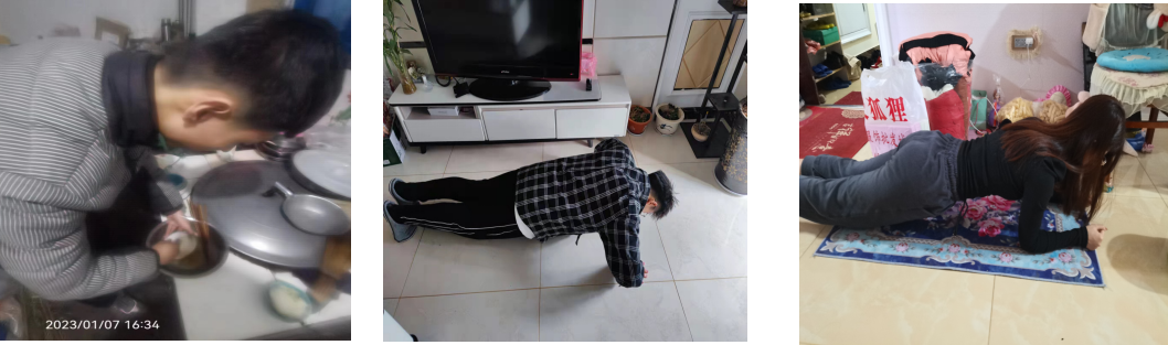 2023年1月7日第四学期小组成员赵梓贺、庞衍涛、关家豪以锻炼为主题进行了居家锻炼这一项目。相对于那些假期躺在床上虚度光阴的同学们,我们选择加强自己的体质,在这疫情肆虐的时期保护自己。在家里做一些有益于身心健康的运动加强我们的体质。德智体全面发展。
