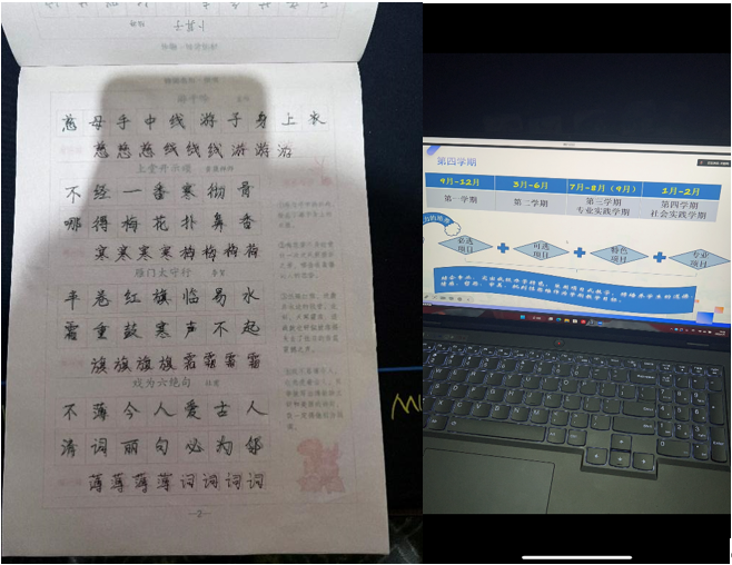 这次直播让同学们了解了第四学期的重要性,并在创校校长、理事会曹永安教授,副院长张振笋等领导和教师的带领下,全校学生更加深入了解第四学期的内容其意义。在第一周的学习里,临摹字帖可以提升实际书写能力,掌握行书的书写技巧,使书写水平在短时间内有一个质的提高,为今后进一步学习打下坚固的基础.,丰富课生活,陶冶情操来提高字帖的书写质量,激发了学习书法的兴趣,“书汉字之韵,享经典之美”,推进字帖书写教育,创造满园书香,我和我的组员们保持着每天一页字帖的习惯,我相信现在第四学期结束后我们都有新的一副面孔。