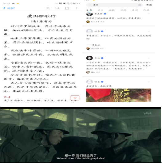 在第一周中,291小组成员,每天阅读了爱国诗句,例如有:康有为的《爱国短歌行》,梁启超的《爱国四章》,短句有艾青,季羡林,胡适等。坚持每天聆听学习强国和,通过看红色影视,让同学们重温党和国家的光辉历史,深受革命先辈们与敌人斗智斗勇的勇气和勇不放弃的信念所感染。让我们感受到革命先辈们英勇无畏,不懈奋斗,不怕牺牲的精神,让同学们砥砺前行,有了无限的动力和力量。