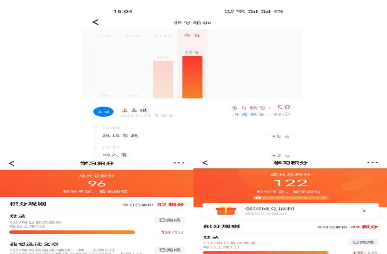 将“学习强国”平台推广使用情况纳入第四学期考核,定期通报完成情况,做到每天学习打卡,完成学习任务积分,营造“比、学、赶、超”的浓厚氛围。2023年1月6日在这一周组长汽服201班孟嘉琪与组员汽服201班王越以及汽服202班宁可欣,三人每天互相监督学习强国知识,了解国情学习更多的党建知识提升我们的理论水平。积分是用来反馈学习情况的,通过积分进行分析利用碎片化的时间,重新感受到学习的乐趣。