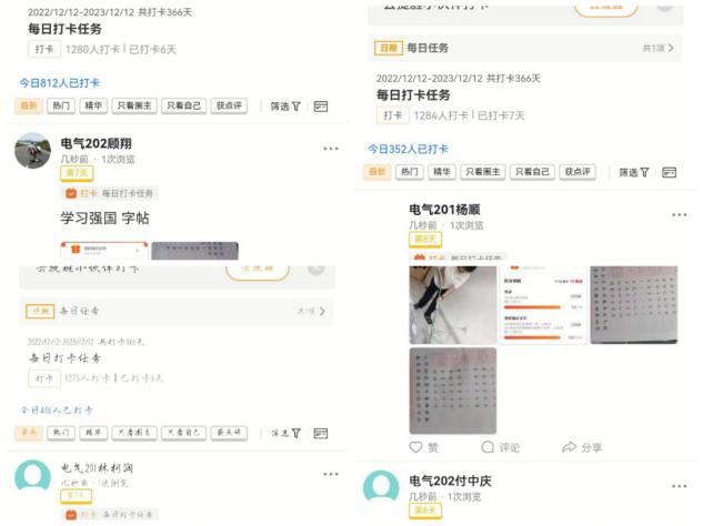 付中庆,杨顺,顾翔,林科润同学积极的响应学校第四学期要求,并且完成了第二周的第四学期任务,每天坚持打卡,每天坚持锻炼,每天坚持临摹字帖。