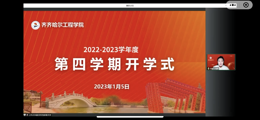 于2023年1月5日晚19:00,为了让学生们更加深入了解第四学期内容,便在线上开展齐齐哈尔第四学期开学式。出席本次嘉宾有创校校长、理事会曹永安教授,副院长张振笋,学生工作处郭明敬老师,齐齐哈尔工程学院委员会指导老师张云惠老师,生涯导师代表健康与护理系相玉秀老师,机电工程系学生工作副主任王丽萍,管理工程系、建筑工程系学生工作副主任孙晓芳,健康与护理系学生工作负责人姜宏伟指导和齐齐哈尔工程学院全体学生共同参加。