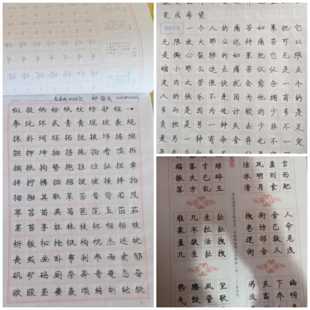 自活动开展一周内我们每天进行字帖临摹,并坚持参与打卡,经过一个星期的练字,组内三人的汉字书写能力有了明显的提高,在这其中又以杨晓光同学的进步最为突出,从一开始的描着写、画着写,到最后的横平竖直、字正腔圆,杨晓光同学的努力我们看在眼里,这非常值得我们其他组员学习,杨晓光同学的进步督促着我们更加认真,更加努力,相信继续坚持下去在大家的共同努力下我们的书写能力会得到显著的提升。