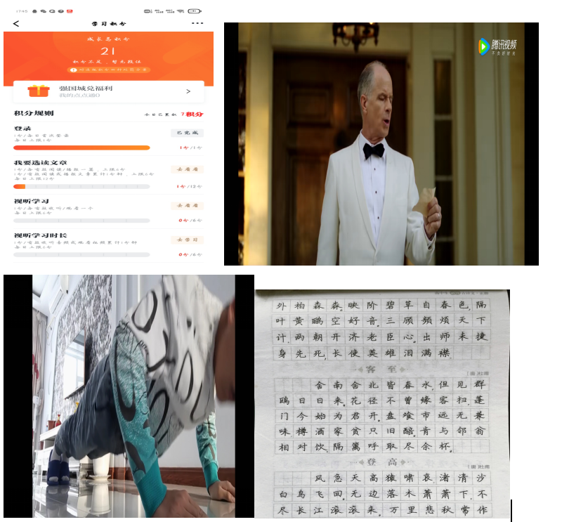 在本周内,每个成员积极完成各项任务。孙鹏博,甘宇航,刘英楠,宋士成同学每天的字帖,时政学习(学习强国)任务都能按时完成,本周的感恩实践我们选择帮家里面打扫卫生。除此之外,孙鹏博同学还坚持居家锻炼,俯卧撑等;甘宇航同学坚持每天做仰卧起坐;刘英楠同学观看了励志电影《绿皮车》;宋士成每天坚持跑步。
