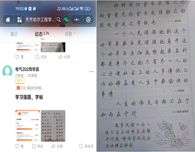 电气202班机电系66组第四学期第二周成果,我们小组成员积极响应学校的第四学期要求,完成每日的字帖、学习强国打卡等任务。
