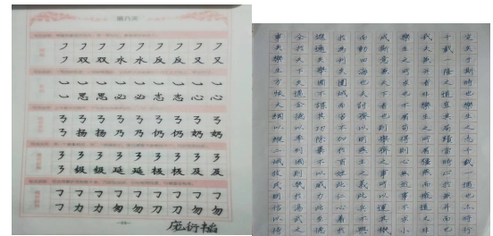 本次活动由组长汽服212关家豪同学主持,我们小组结合自己书写所需,选择了自己想临摹的字帖,学校一直注重学生的汉字书写能力,使学生都能练的一手好字,经常临摹字帖有利于陶冶情操,培养我们的汉字书写能力。要落实学校的汉字书写能力经常临摹字帖,书法是中华民族一门传统艺术,学习书法能够锻炼到我们的身心。练习写字贵在坚持,把每一笔画写好,需要大量的机械的练习。写的时候心不慌、气不短、手不抖,做到挥笔自如,气定神闲。字的间架结构更需要长时间的练习。唯有此,才能在练好笔画的基础上,把字写出神韵。练字能使我们沉稳大气能使我们获得很多一生受益的习惯,敛去时下浮躁心境。