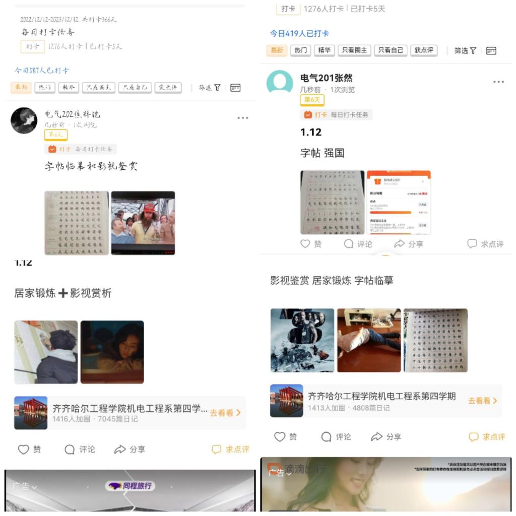 机电系77组的同学,在本周中,同学们每个人每日都完成一篇字帖的书写以及在学习强国中的学习,并且完成了一次健身锻炼和影视赏析。本周的实践任务大家选择了为父母分担一些家务,除了尽孝心之外,也帮助父母分担一些生活中的琐事。