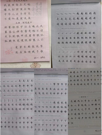 纪帅琪、王利芳、张英杰、黄士宸、李雯丽各自在家开展,经过一段时间的临摹之后在交流群内展示了每天的字帖临摹作品,并相互评价了同学们的临摹成果,交流了字帖临摹活动带给自己的感受。