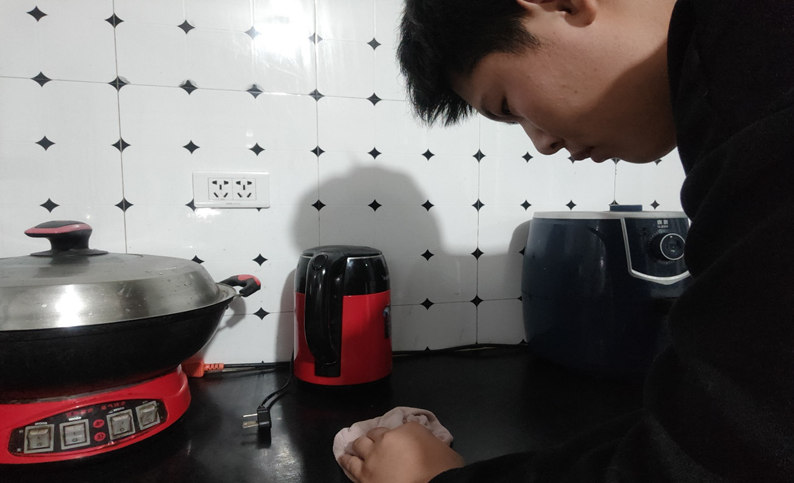 接下来就是擦东西了,所有房间的窗台、床头灯、床头柜、茶几、电视柜,还有家具的顶上面,都是平常打扫卫生的时候不会扫的,只有大扫除才会扫。我一直认为家里应该很干净,不会有多少的灰,但是擦的时候才发现,灰太多了,没擦多少抹布就脏兮兮的了。既然都开始打扫了,我就要把它做到最好。所有地方都擦完之后,我又换水再擦了一遍。 看着所有地方都干干净净的,我非常的开心。最难打扫的就是厨房了,到处都是油腻腻的,需要用洗洁精把每个地方都擦好几遍才 能擦干净。我是先用洗洁精全部擦一遍, 再用专门清洗厨房的去油污的清洗剂洗遍,最后再用清水擦-遍。这样一个流程走完之后,厨房干干净净的。