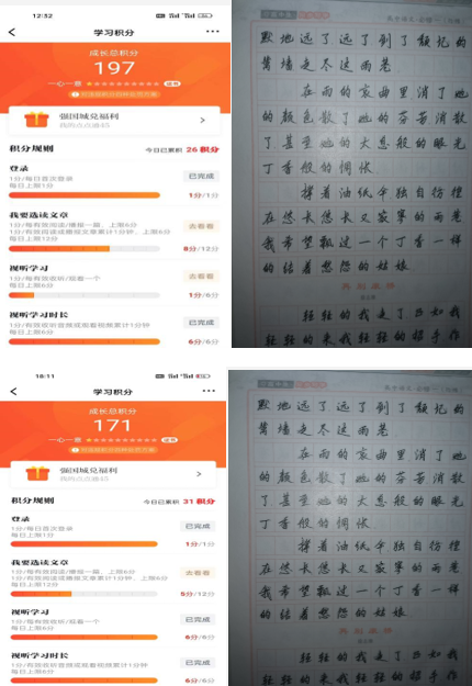 本周我们小组将延续字帖临摹及学习强国任务,迄今为止,小组字帖总数约达25篇,学习强国总分数约达600,每个人都积极参与第四学期,完成每日打卡。