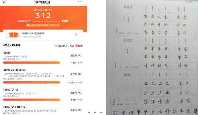 首先,练字帖的好处:第一、练字非常必要,期末考试机器阅卷都是必然的。答题的规范和字迹清楚直接关系到学生们的考试成绩。第二、培养学生们的自律,练字表面上或者短期是为了书写美观规范,实质上或者长期是培养自律能力,就像当兵入伍训练队列走正步,规范被子豆腐块。其好处在日后慢慢才能体现,不要短视,急于求成。形成了自律,对以后学习、工作、生活都是有益的。第三、培养审美能力及爱中华汉字文化的情怀。没有规矩不成方圆,汉字也要规范起来!写得一手好字不仅仅可以让阅读者感到非常舒服,更会陶冶自己的情操。汉字是中华文化的骄傲,那一撇一捺都表现出了我们历史深厚的底蕴,写一手好字更是许多人的追求。通过练习字帖,我们小组成员懂得了练习字帖的重要性。最后,我们小组知道了看学习强国的意义:通过合理利用学习强国,认真开展自学,既能提高党性修养,又可以增加学习内涵。在工作中助力提升工作素养,在生活中助力增加学习氛围,是一个优秀的学习平台。现在这个时代,碎片化的信息很多。但学习强国能让我们静下心来了解一些事情,看一些观点,这是很好的。我们能及时的跟进形势,国际上的一些热点、新闻,让我们及时了解,丰富了我们形势政策的知识储备。