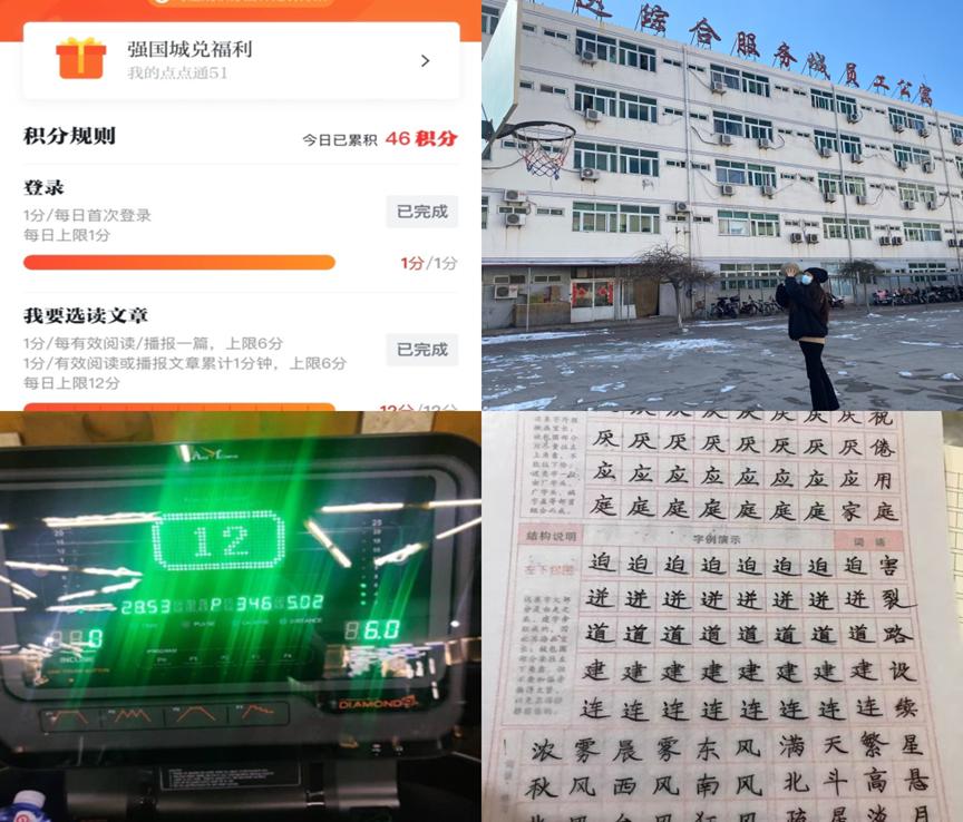 汽服201班第四学期第一周从1月2日开始,到1月6日结束,在此期间,机电系215组的同学马明鹤、王安琪、张振鹏,在家中完成每日的字帖临摹、学习强国和居家锻炼任务。