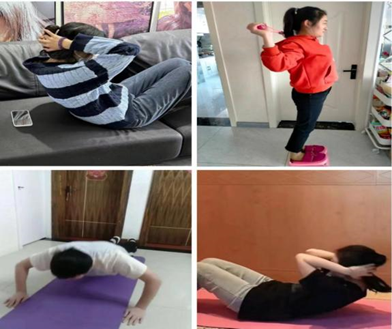 长时间不运动,现有的运动能力会出现倒退,为了持续提高运动能力,我们小组开展了居家锻炼活动,通过一些简单的运动如深蹲、仰卧起坐、俯卧撑、跳绳等等来保持我们的身心健康。