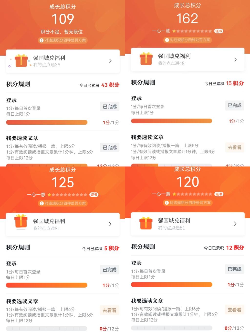 为了让假期生活更加充实,通过“学习强国”平台的学习,能改变的生活。平台可供全天候学习,方便快捷,能上网就可学。平台学习采取积分制管理,坚持学习就是热爱生活。机电系233组第二周1月12日在家中进行强国学习活动,参加成员有衣见娥,赵若曦,肖剑,潘明礼。大家互晒积分截图,不断勤勉进步!