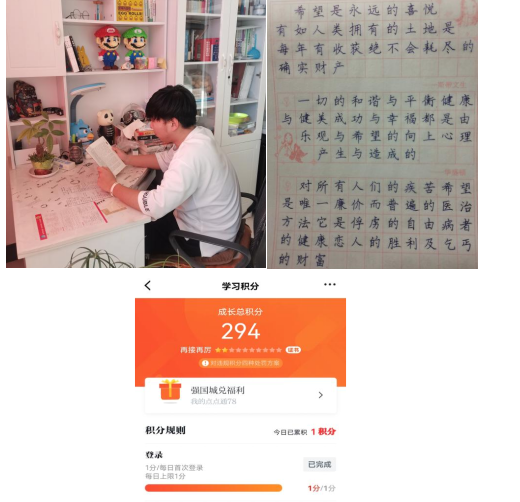 实践过程中每个成员每天都在进行汉字书写的练习,汉字书写并不是任务是在为自己的能力打基础,即便任务再多也会找出时间练一页。进行了两周的学习强国项目,小组内展开了一次讨论会议,在学习过程中大家了解到国家的一些相关政策,并且深入学习,在会议中,高金海同学认为这些政策对以后的就业有一定的帮助。在此之外,小组成员申玮楠也进行了读书学习并与大家分享。大家了解到读书并不是任务,学习不要松懈,不进步就是落后。