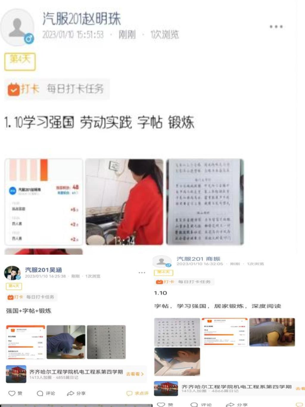在2023年1月8日组长商振带领组员吴涵与赵明珠同学在家中学习学习强国中的知识,了解我们的国家,学习更多的党建知识,丰富我们的阅历,提高我们对党的认知水平,通过积分的获取方式全方位的去渗透进学习强国之中,感受到获得知识的乐趣。
