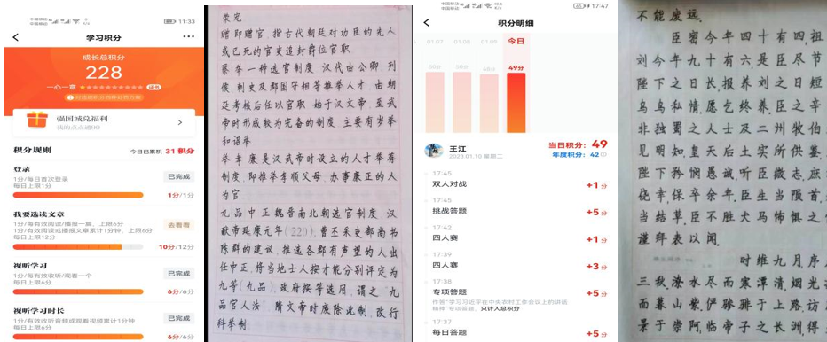我们四位成员在假期中非常认真的在完成任务每天坚持打卡,在临摹过程我们认真进行临摹提高自己的书写能力,大容量的“学习强国”增强了我的学习兴趣“思想田野里的每一寸躬耕,总能在实践中寻得收获”,在这一周的学习提高了我们小组的阅读能力和分析能力让我们可以了解国家实时、祖国的大好河山、祖国发展。在每天的空闲时间我们还会帮父母做做家务,锻炼自己的动手能力和父母谈心。
