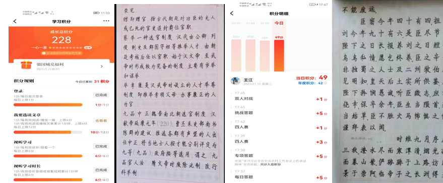 我们四位成员在假期中非常认真的在完成任务每天坚持打卡,在临摹过程我们认真进行临摹提高自己的书写能力,大容量的“学习强国”增强了我的学习兴趣“思想田野里的每一寸躬耕,总能在实践中寻得收获”,在这一周的学习提高了我们小组的阅读能力和分析能力让我们可以了解国家实时、祖国的大好河山、祖国发展。在每天的空闲时间我们还会帮父母做做家务,锻炼自己的动手能力和父母谈心,通过这次活动让我们受益匪浅。