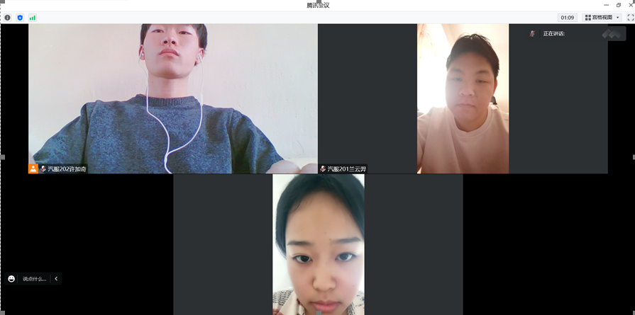 由于疫情及小组成员距离问题,我们小组利用腾讯会议开展了线上阅读分享交流会。在此次交流分享会中,我们小组采取先逐一分享,再总结讨论的模式进行。每个成员首先介绍自己在这一周所阅读的书籍的名称、大概内容;然后在说出自己在看书过程中的感悟、体会,以及自己的发现或疑惑;每个成员介绍完后我们都会对该成员所介绍的书进行一次小小的讨论,为该同学解惑,以及曾经看过这本书的成员对这本书提出自己的见解与感悟。待所有成员介绍完书籍后,我们小组成员会总结一下在此次阅读分享会中自己的收获、感悟,最后再由组长进行总结结束此次分享交流会。