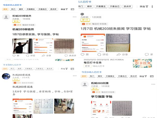 在第一周的实践生活中,该小组各成员相互配合、相互督促,圆满完成了学习强国、字帖临摹和感恩实践等活动。并且在本周的实践任务中,该组组长柳皓然积极督促组员每天任务的进行,并在任务完成以后进行打卡;组员朱振闻、刘景、蔡国康积极配合组长工作,在完成感恩实践活动时积极投身于劳动当中,没有弄虚作假的情况,符合学院培养学生劳动能力的宗旨,提高学生的劳动积极性,为学生改掉好吃懒做的坏习惯。