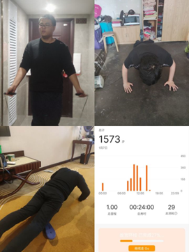 每天进行适量的运动,如进行垫上俯卧撑、仰卧起坐、平板支撑、广播操、跳绳、跑步等形式多样的强身健体活动。在体育锻炼的过程中,我们互相汇报了成果以及图片。通过持续近一周的锻炼,我们的精神面貌得到了显著提升,为之后的第四学期实践活动打下了良好的基础。这就是我们本周主要完成的工作与任务。