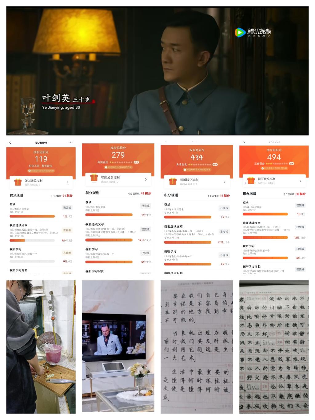 本周内,同学们进行了影视赏析交流,付科翔同学观看了电影《建军大业》并写了300字的观后感。积极报名参加志愿服务清扫社区街道。每一天,都要临摹字帖,在学习强国中学习,每日学习积分在45分左右,锻炼1个小时左右。本周的感恩实践我们选择了为家人做饭,不仅锻炼自己做饭的手艺,还让我们尽孝,让父母舒心。