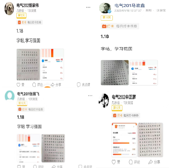 这周已是第四学期的第三周,已经过去了近一半,在此期间,机电系91组的同学完成了每日的字帖、学习强国打卡和每周的感恩实践任务并上交到每日的打卡当中。