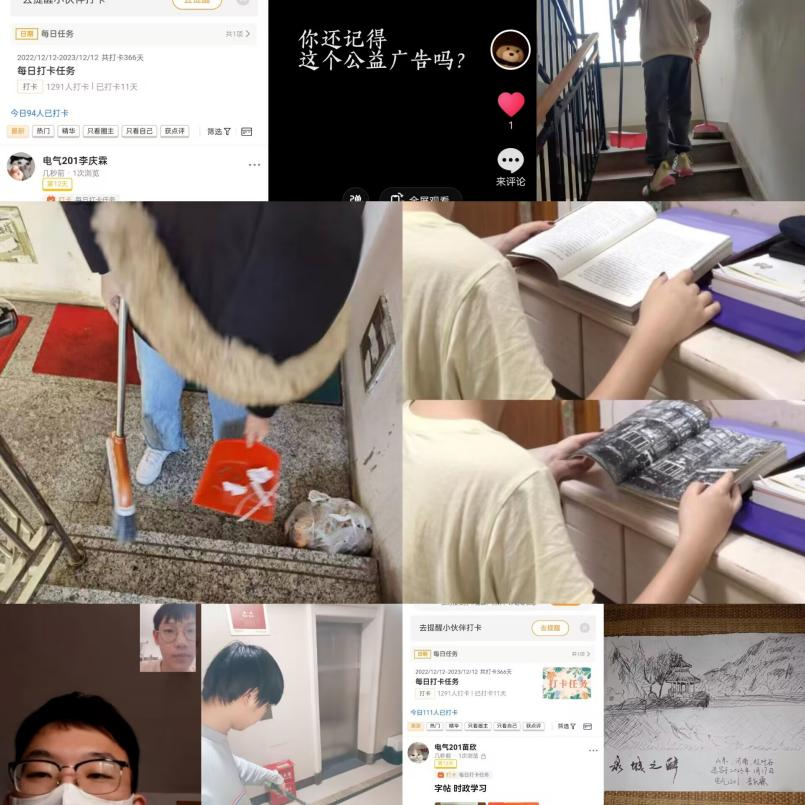 电气201班第四学期第三周从1月16日开始,在此期间,机电系94组的同学完成了每日的字帖、强国打卡和每周的感恩实践任务,并且完成了读书心得、文艺展示、志愿服务任务。