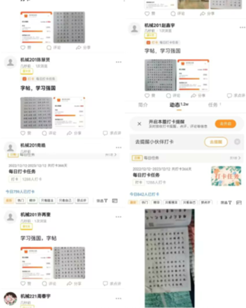 在本周实习中,首先我们全组每天都坚持对字帖进行书写,按时按点提交,并不断改正自己的写字帖时候的坏习惯,以便于日后步入职场可以有更多的优势。随后,在本周我们每天依旧坚持学习强国APP进行的各种相关国家消息进行阅读和对相关的题目进行答题,每天获取一定量的学习积分,并截屏后按要求发至打卡区打卡,记录自己的每天的成长。最后,我们将会每隔一段时间全小组成员进行电影赏析并在观看完毕后写下自己的心得与体会,加深对本次学习内容的印象。