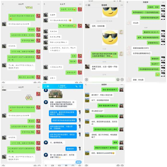 由于疫情原因,学校加强学生校园管理,小组成员采用线上微信交流方式进行活动。在聊天中,我们表示了本次活动的内容和目的,组员们分别对老师表达了感谢和思念之情,老师也向我们询问了大学的情况。我们永远会记着老师对我们的恩情。最后我们向学弟学妹们讲述我们的高考经验和大学感受,激励他们在未来的学生生涯中努力学习,给未来的自己一个满意的答卷。经过各个成员的努力,小组顺利完成此次线上活动。本此活动,不仅让我们和母校有了再一次的交集,也激励了学弟学妹们努力学习。