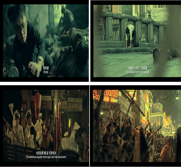 这部电影给我最大的感触在于一河之隔两种不同的景象,一半繁华景象和一半的战争场面给人带来视觉冲击。感触最深的一幕是每个晚上四行仓库的军人们看着对面的繁华景象,那是他们向往的、想要的生活环境;对面的学生想要去到对面和军人们为了这个国家去奋斗;一根电缆线看似平凡却是用一个个人的尸体趟过去的,他是四行仓库的军人与外界联系的唯一途径,他是托起后半段剧情的重要纽带。