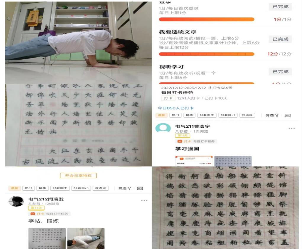 为了加强汉字书写能力和自我身体素质的提高,培养学生的爱国情怀。我们在第四学期的第三周进行着字帖临摹,居家锻炼和学习强国的实践活动。