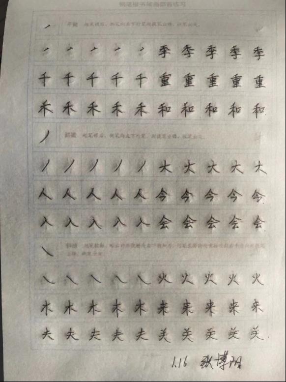 总之,经过这段时间的描摹,我的字明显有了很大的进步,不要急于求成,只要再坚持练习,相信我的字也会像字帖上那样,看着就很舒服。不是说字如其人,字美,那我给别人的印象分就会增加。我们只有认真临摹,虚心学习才能掌握。如果没有古人的经验作为基础,我们想创造出自己的风格来,跟定不会肯定不会成功,会成为无源之水、无根之木。只有在深入掌握前人的规律,加上我们后天的勤奋苦练,再有机缘,我们才可能写出自己的特点。会通过这次的字帖描摹活动会丰富我们的业余生活。