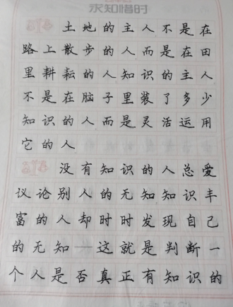 只有这样才能陶冶自己的情操,才能让自己慢慢的平静下来!每天都让自己成长一点点,要有益于意志的锻炼,促进文化课的学习,临摹练字可以让我进入书法的一定境界,给自己带来一定的书法成长!