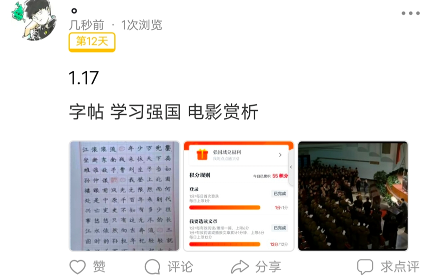 2023年1月18日,是第四学期进行的第三周。本周依旧每天进行着字帖临摹,学习强国和电影赏析。
